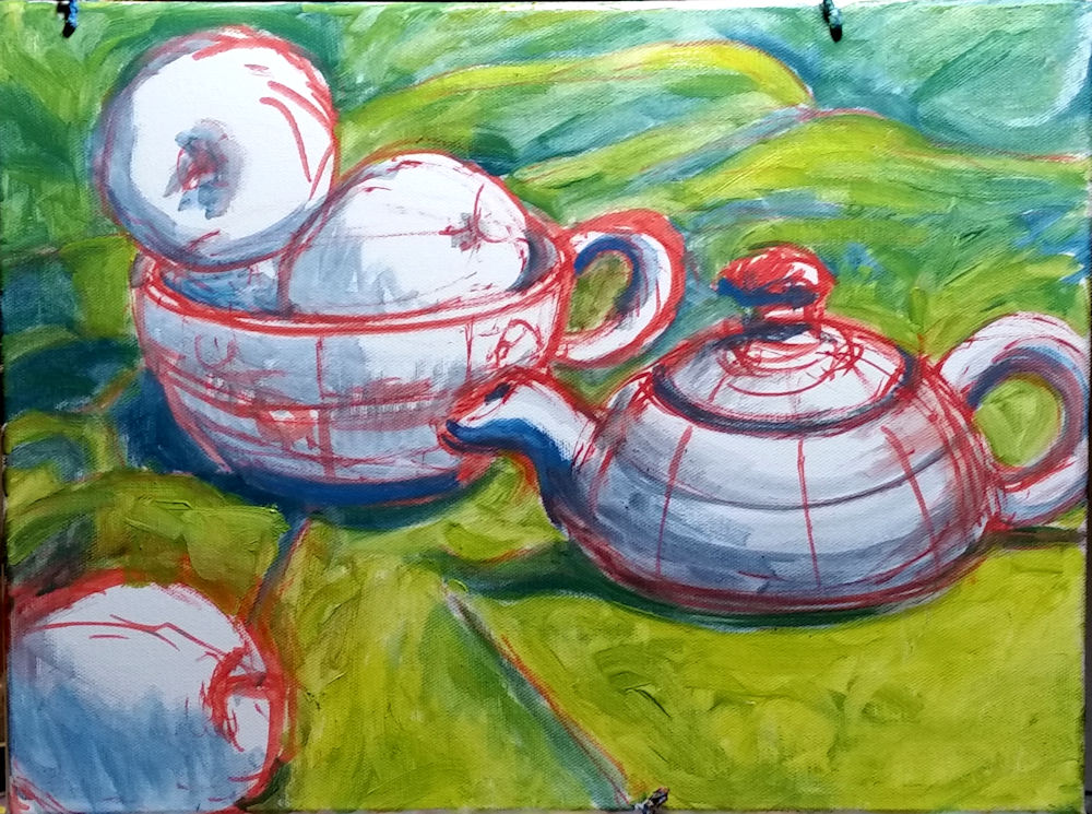 I began with a rough sketch in oil directly on the canvas. Then I blocked in some shadows just to give the objects volume.