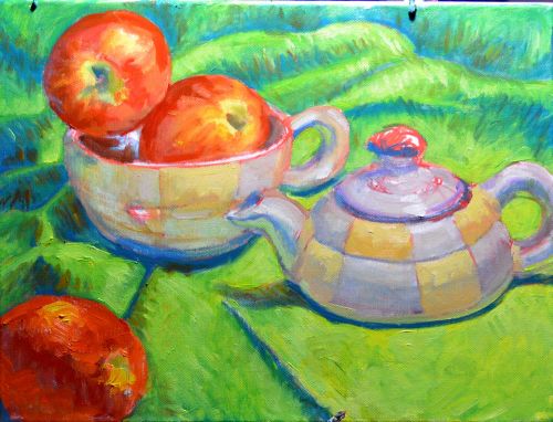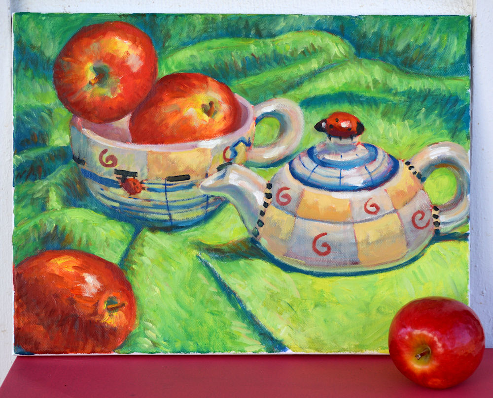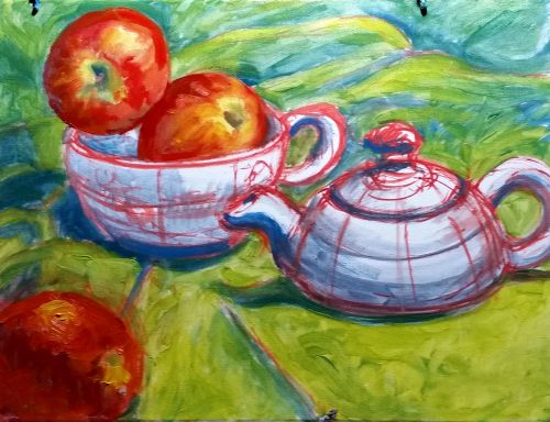 The next step was to work on the apples, then work on the patterns of the teapot and cup.