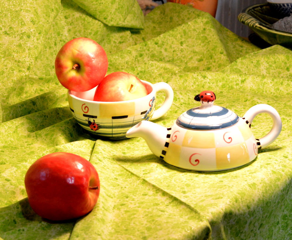 I was looking through my prop cupboard and spotted this cute ladybug teapot. It’s actually a teapot/cup combination. I’m not quite sure where I picked this up. There is a receipt in the top that says Canada but I’m sure that I just got it at a resale shop. Maybe even in Canada when I was there a few years ago. Anyway, I love the whimsical style and colors. I decided to pair this with some bright green fabric and red apples. It’s almost Christmasy in colors but really, this could go any time of year.