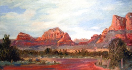 I fell in love with the red hills of Sedona, Arizona on my recent trip there. This is a painting of the hills just north of Bell Rock at sunset. Even with these vibrant colors, I could barely capture the beauty of this area.