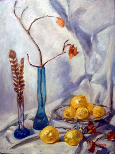 Still life, blue bottles and lemons, final. 18×24 oil on canvas