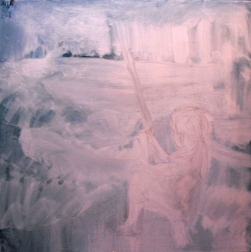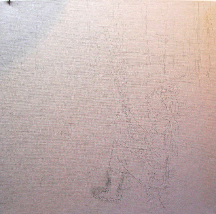 I then washed the entire canvas in a neutral tone, leaving only the highlights and wiping out some other areas. This technique somewhat emulates grisaille, painting the entire painting in grey.