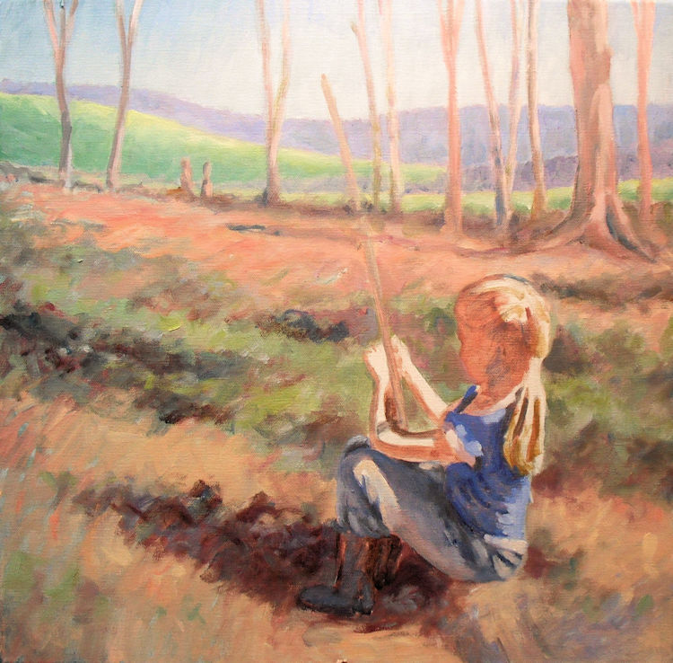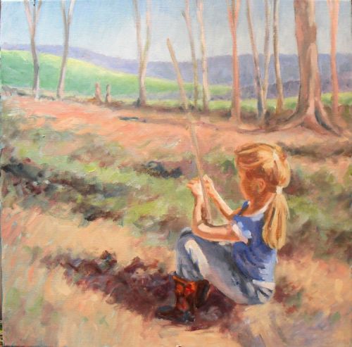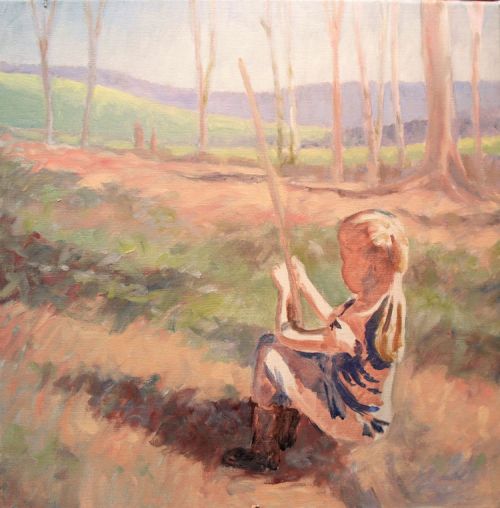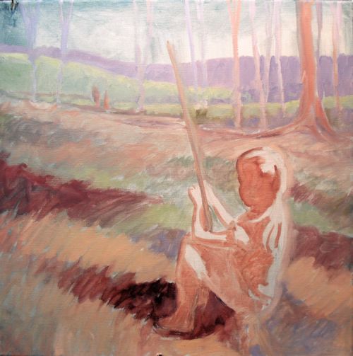 I have often painted series of paintings but this is the first time that I remember painting a pair of paintings. The Huntress I and II are 20 inch square oil on canvas. They both depict a young girl carrying a staff in the woods. The time is a warm day in early spring.
