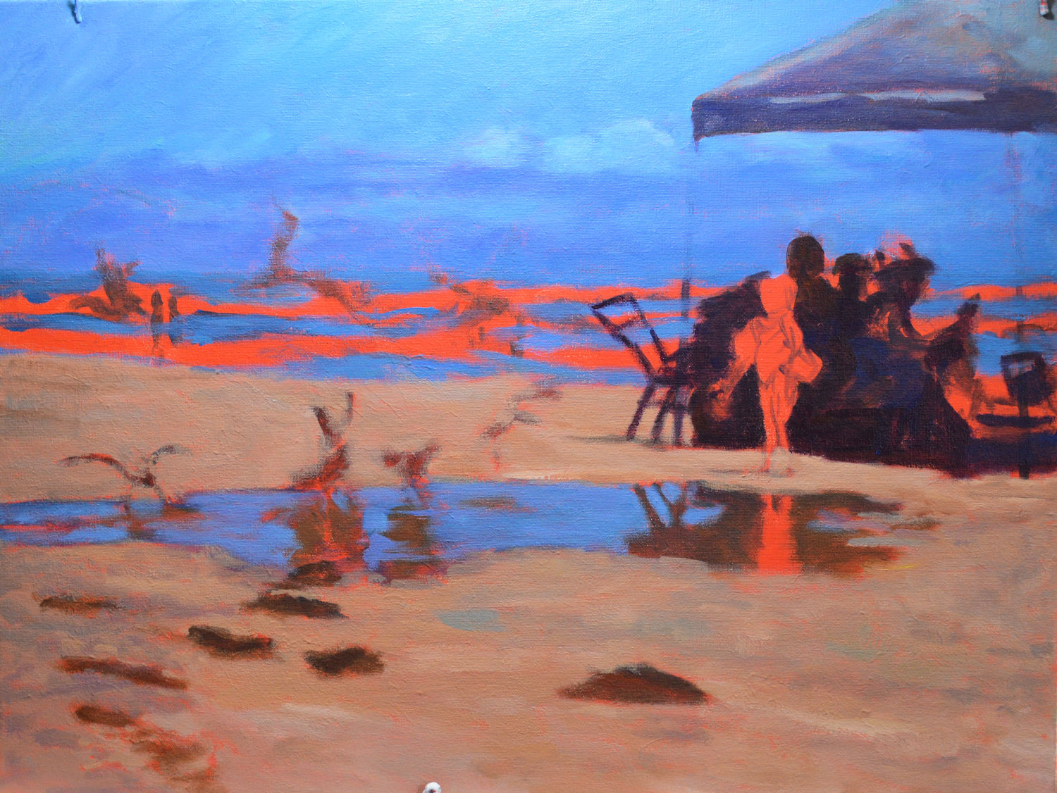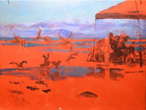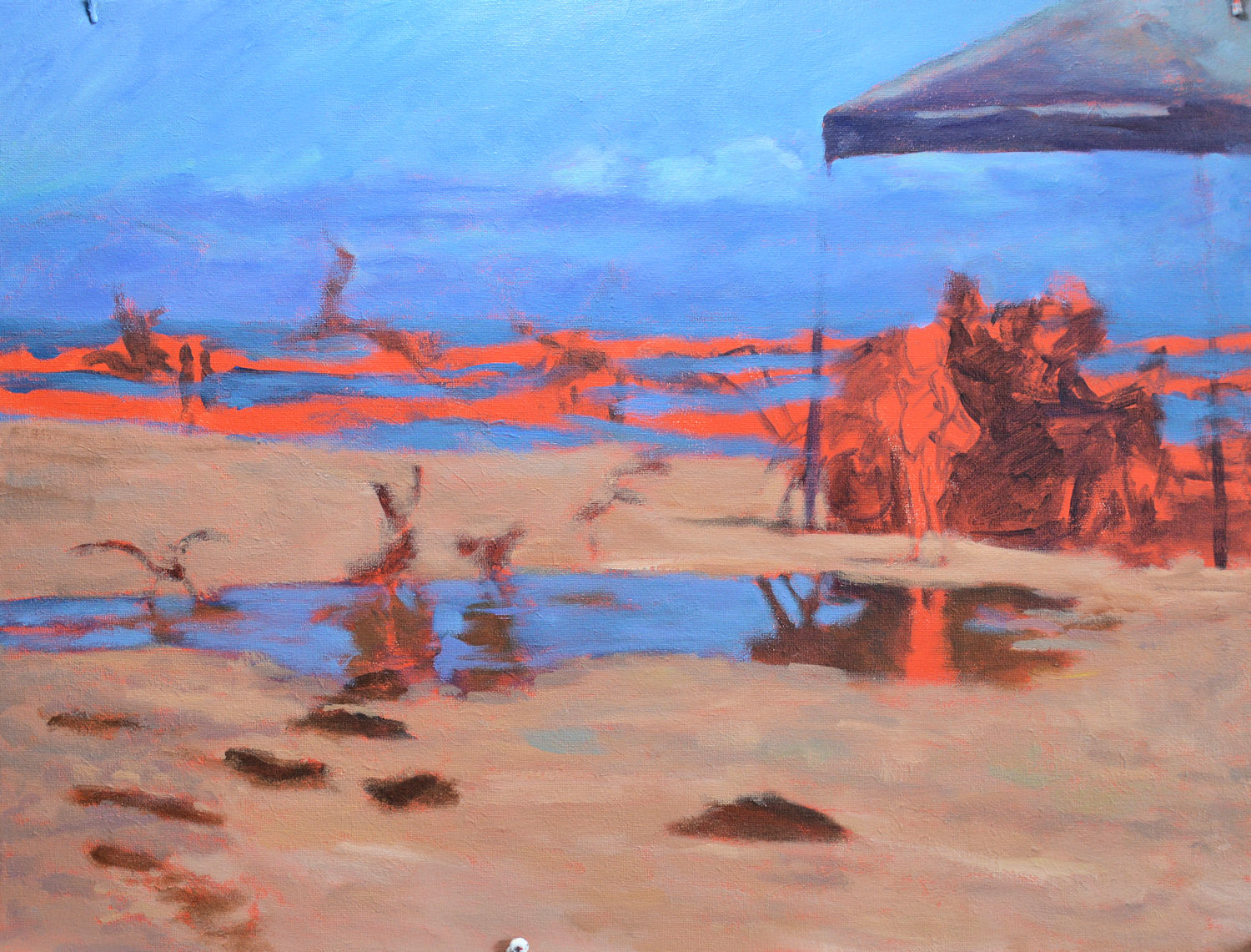 The canvas was gessoed and textured. Then it was primed with an orangey color. This warm color adds to the beach effect when small bits show through in the painting.
