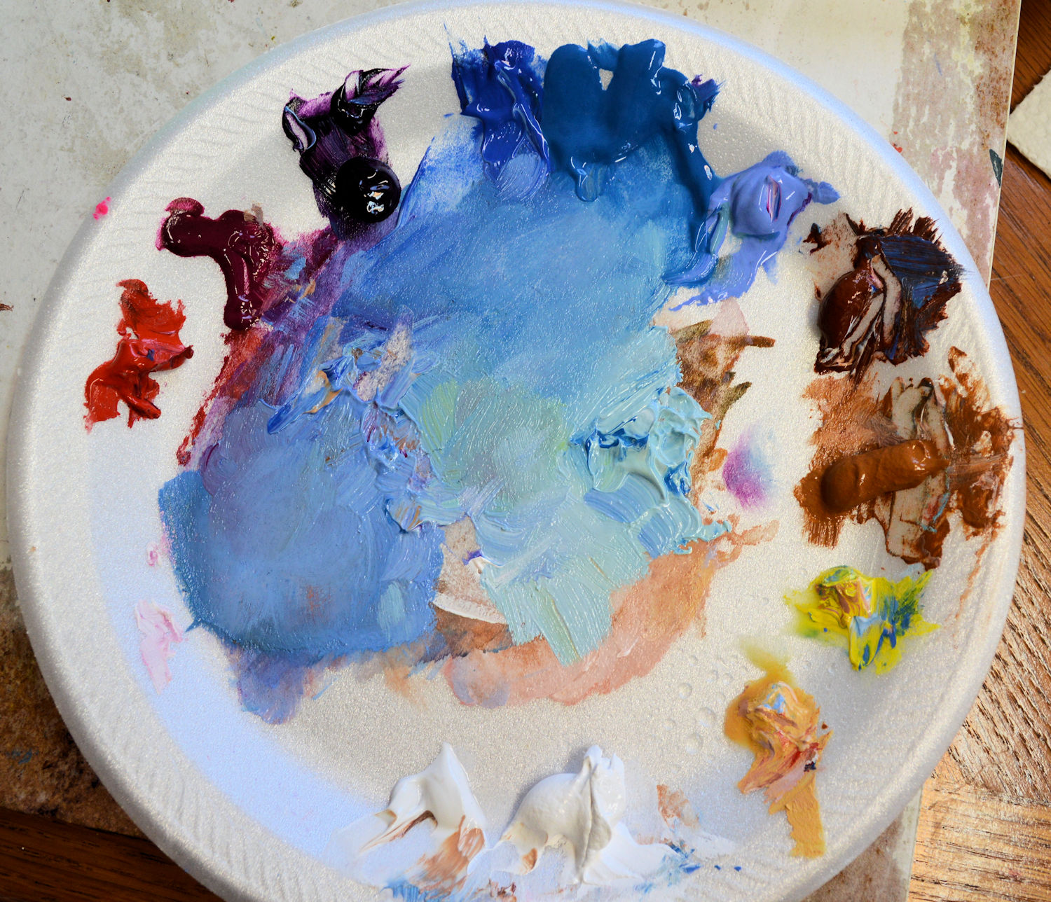 Painting with a limited palette. These are both Golden and Liquitex acrylics, clockwise starting at the left. Cadmium red medium, quinacridone magenta, prism violet, cobalt blue, cerulean, light ultramarine blue, burnt sienna, raw sienna, cadmium yellow medium, Naples yellow, titanium white, flexible modeling paste to add texture. As you can see, my palette is a Styrofoam plate. I hate cleaning my palettes and these are disposable. Not shown here is a fluorescent pink.