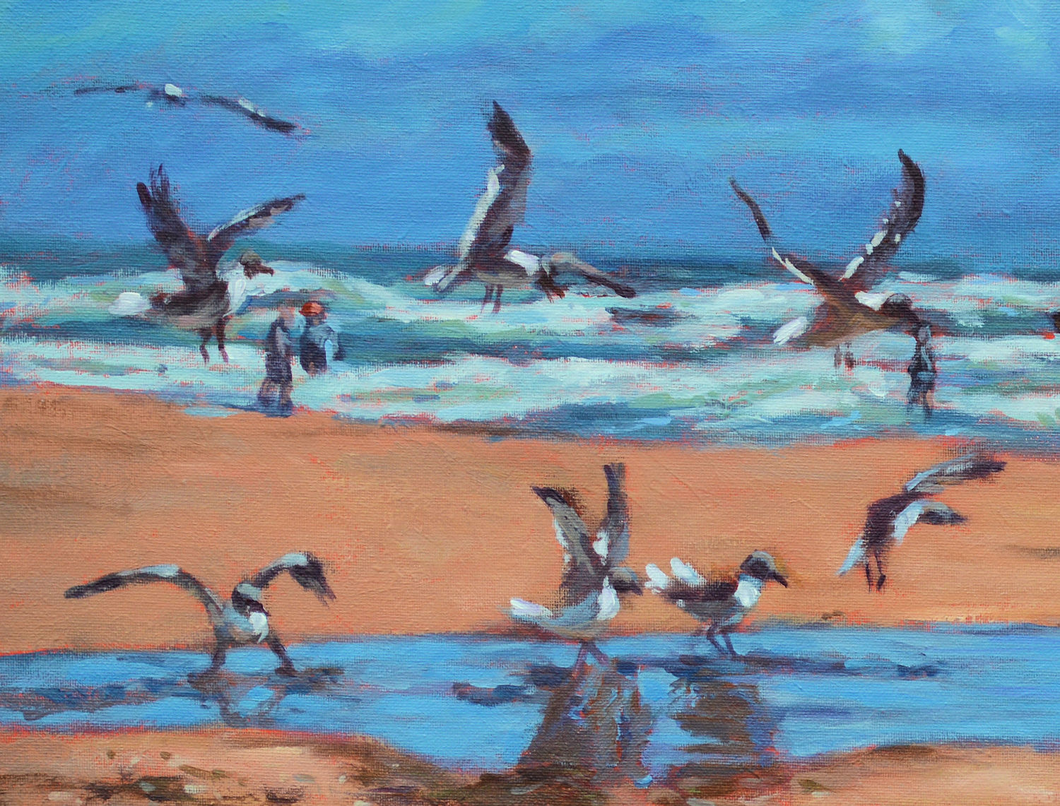 But….no matter how much planning may be done, there are always surprises for the artist and changes to be made. After I had finished the painting, even including my signature, I examined it the next day and it was very obvious something was wrong. I invited my son to comment and he smiled a sly smile. We both laughed. The placement of the beach figures made it look as if they were being attacked by giant seagulls! Ha ha. Those were painted out which helped focus the subject back on the girl and birds.