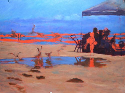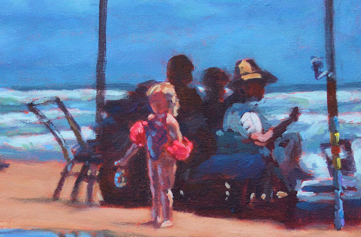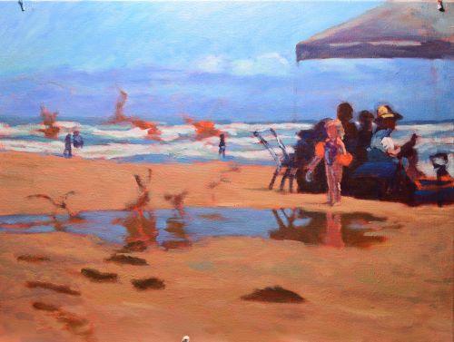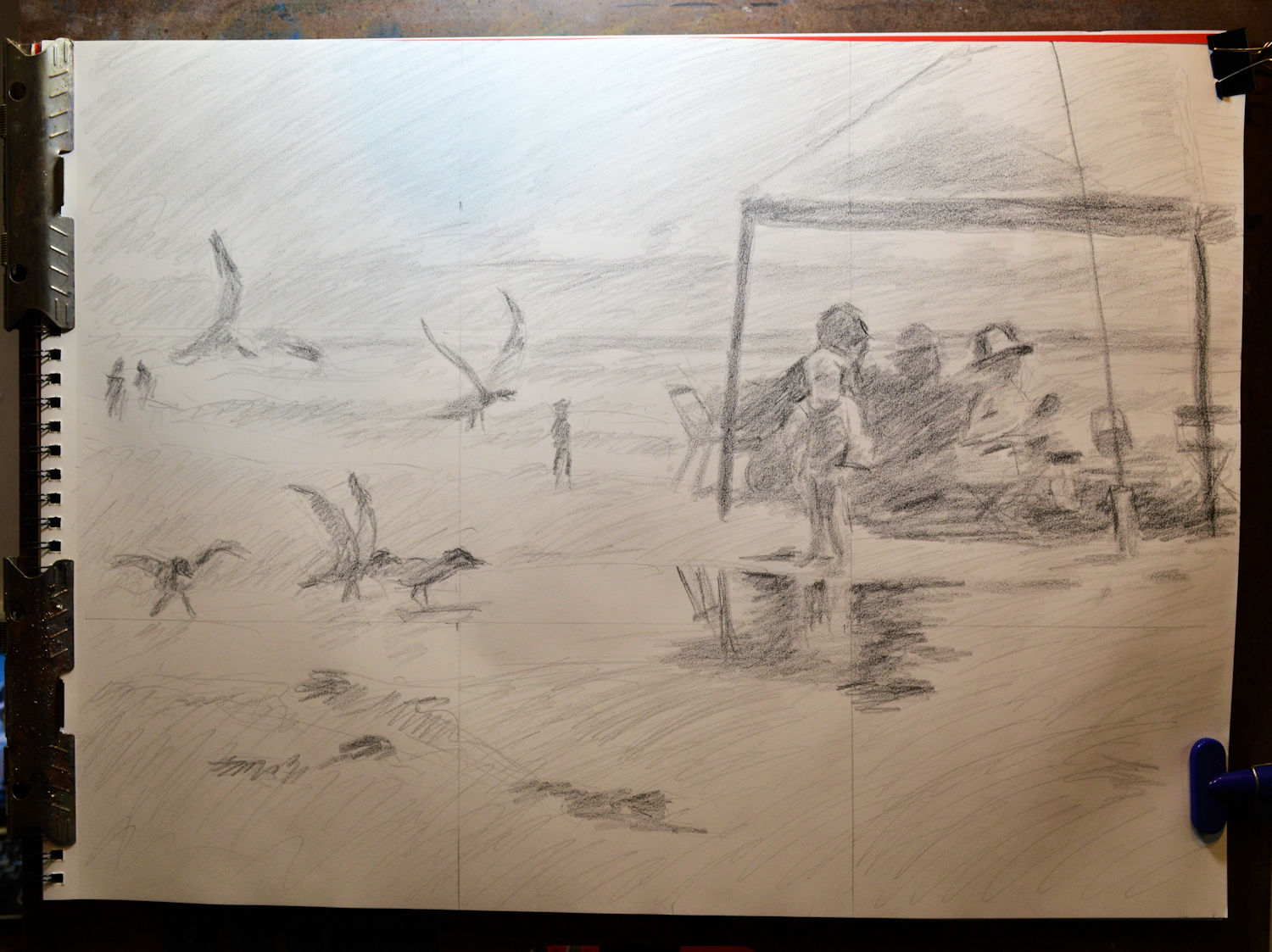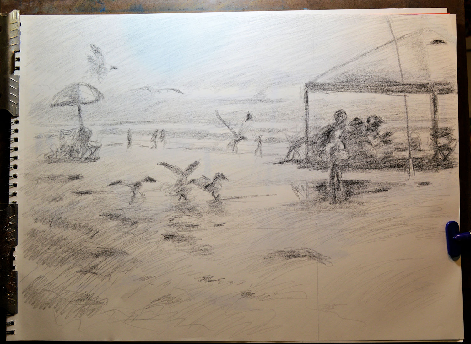 Initially my sketches for the full size painting included more figures, a grouping with an umbrella on the left side, and some figures in the water and walking along the beach. (More on that later.) One of the challenges with any landscape painting is determining the central subject of attraction. I kept scaling back, cutting out the grouping on the left, then most of the figures along the beach. Finally, you’ll see, that I even simplified the figures under the tent; you can tell that they’re people but aren’t distracted by details.