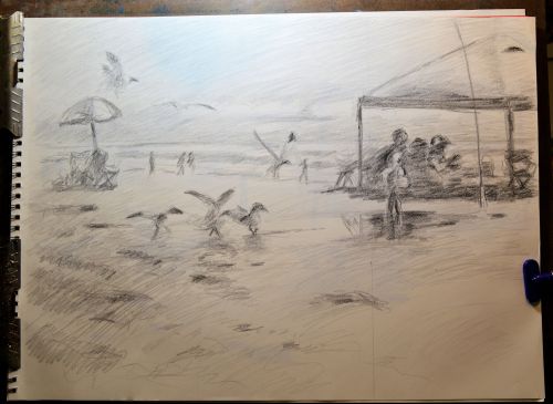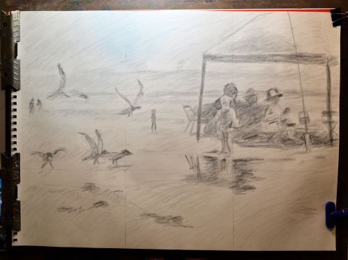 Wings, step 2. Here I have laid in the beach and foreground clumps of seaweed, as well as some of the waves on the sea.