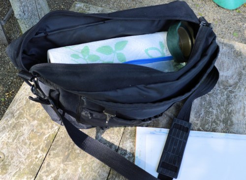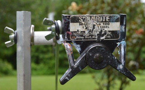 My personal philosophy is to keep my equipment portable and lightweight. I currently keep a backpack or other carrying bag (purchased used at a resale shop) packed for each type of medium I use. The messenger bag that I use for watercolor was $5 at St. Vincent de Paul. The bag I use for acrylics or oils is an old backpack. I even keep a backpack with gear for framing if I should be at a competition where I need to submit a framed painting.
