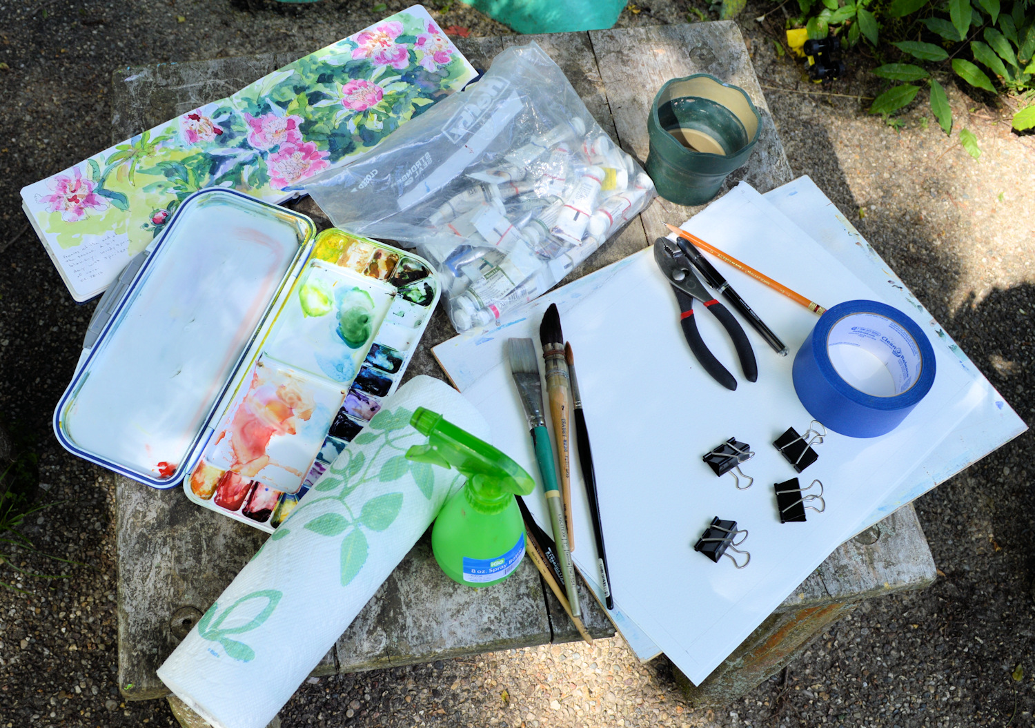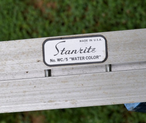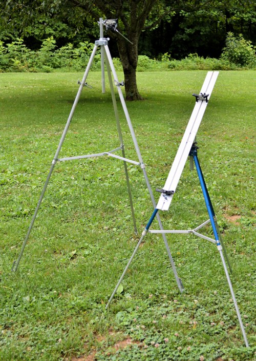 I have a couple of lightweight aluminum easels, one for watercolors (it tilts) and the other for vertical works on canvas or board. They have extendable legs and even have spikes which are handy for anchoring your easel. But, you can use your lap, a rock or fence, or other handy surface to support your work. You can even make your own. (Check here for instructions from James Gurney.) I carry my easels in a bag that I made from an old pair of jeans. You can’t imagine where that bag has traveled.