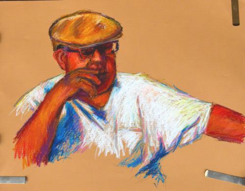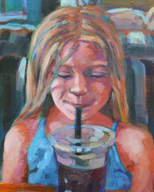 As usual, I did some preliminary drawings of the child. These are just to familiarize myself with the subject. I then sketched him on the canvas, a straight-on shot. Then I began playing with background colors. I elected to use some very bright and warm colors, radiating out of the figure.