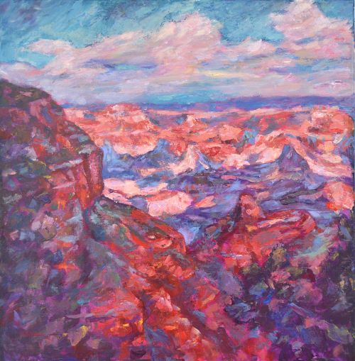 Grand Canyon from the South Rim. Cloud shadows on the rocks. Painted in impressionistic style in acrylic, 20 x 20. Kit Miracle