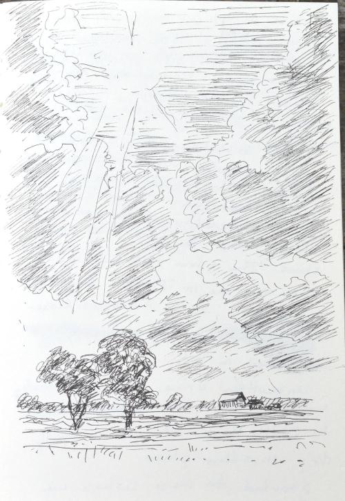 Sun breaking through the clouds over Arkansas, sketch, Kit Miracle