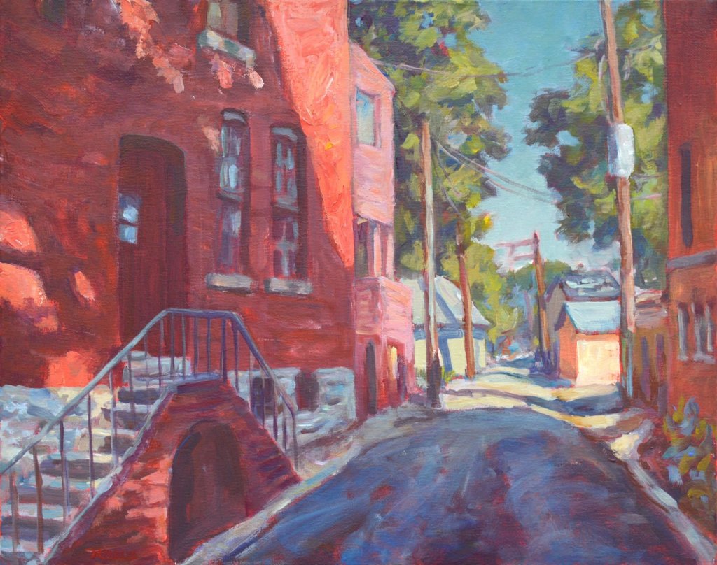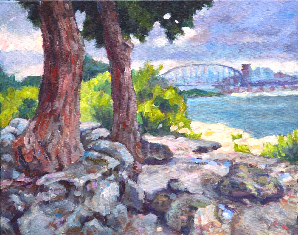 I most often use framing in landscapes, cityscapes, and sometimes interiors.  This means that I’ll often place a large tree or bush near the front of the picture frame, usually on one side or another, with the main view in the middle distance.  This leads the viewer’s eye into the painting and directs its focus.