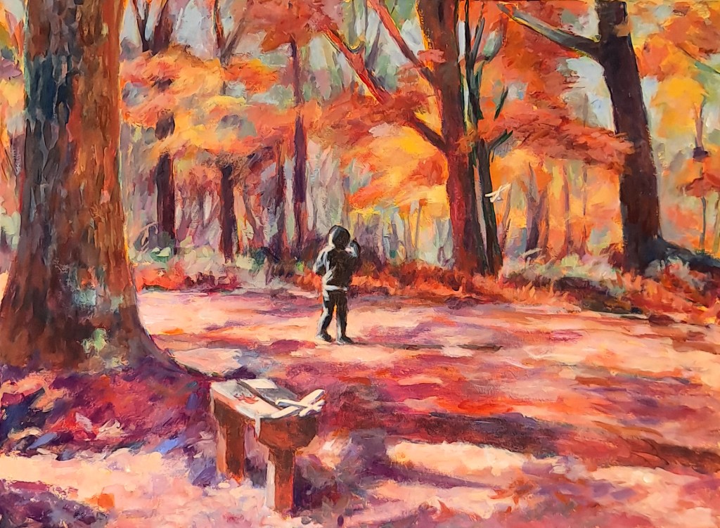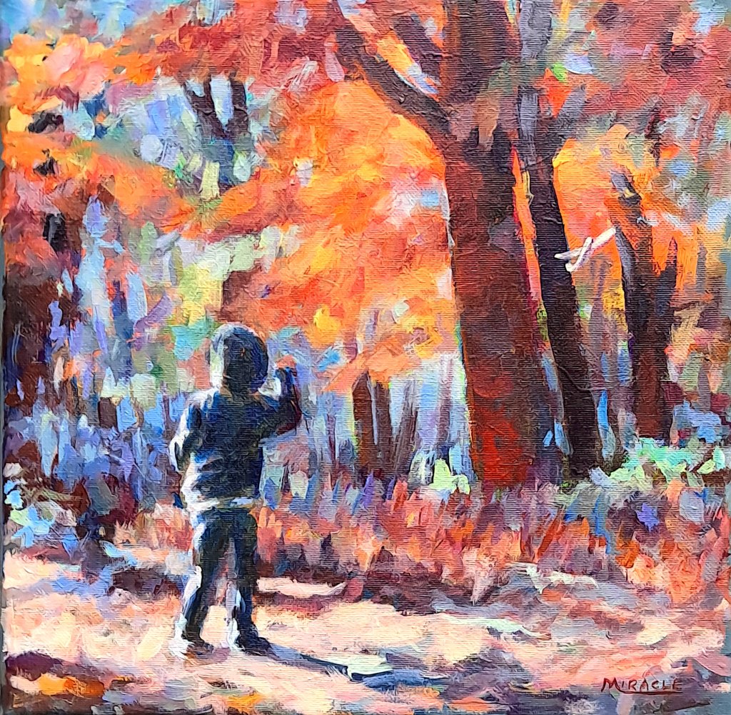 In a recent couple of paintings of the same subject – a child flying a toy airplane at the park – I first explored just the child and the plane.  In the second painting, I used the framing composition to lead the eye from the near subject matter, to the large tree on the left, to the child and plane in the background.