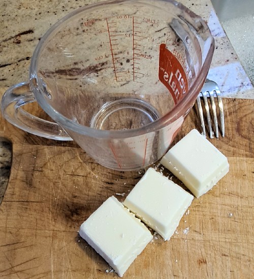 You will need four squares of white almond bark in a 2 cup Pyrex measuring cup. Melt in the microwave about 1 minute and 20 seconds on medium. Pull out, start breaking up the lumps with a fork and stirring around. The heat from the cup melts the icing. Put back in the microwave about another minute. Then pull out and stir rapidly to continue melting the almond bark.
