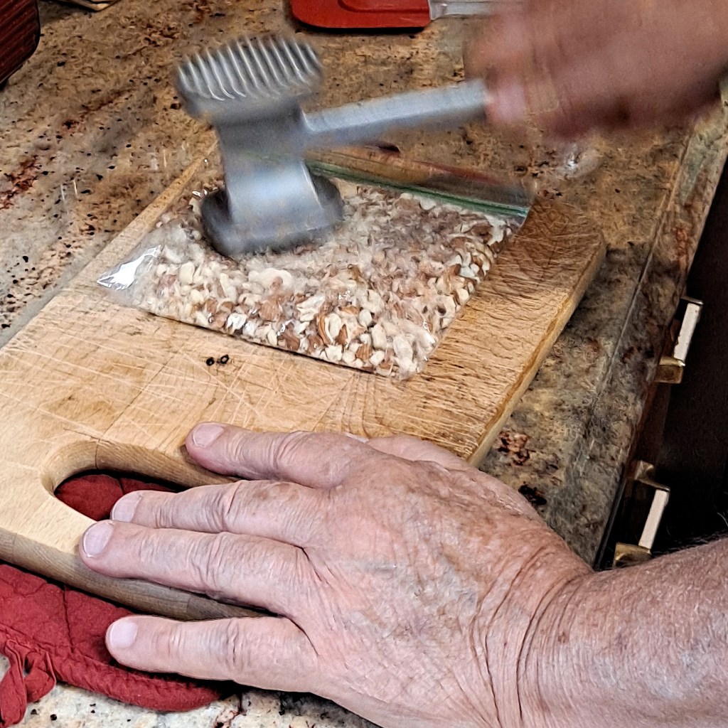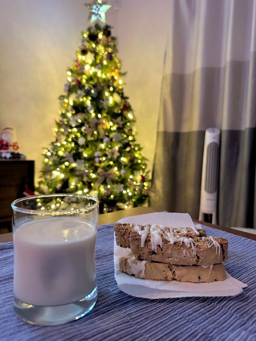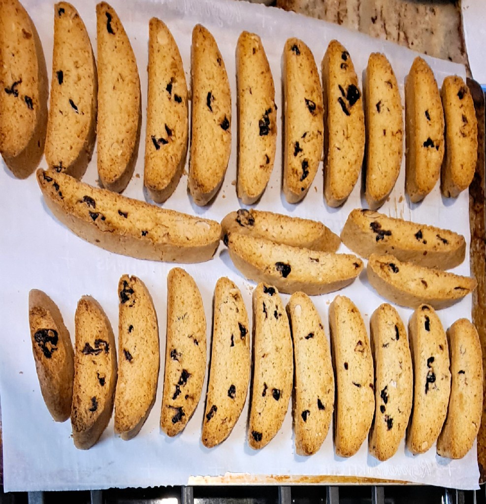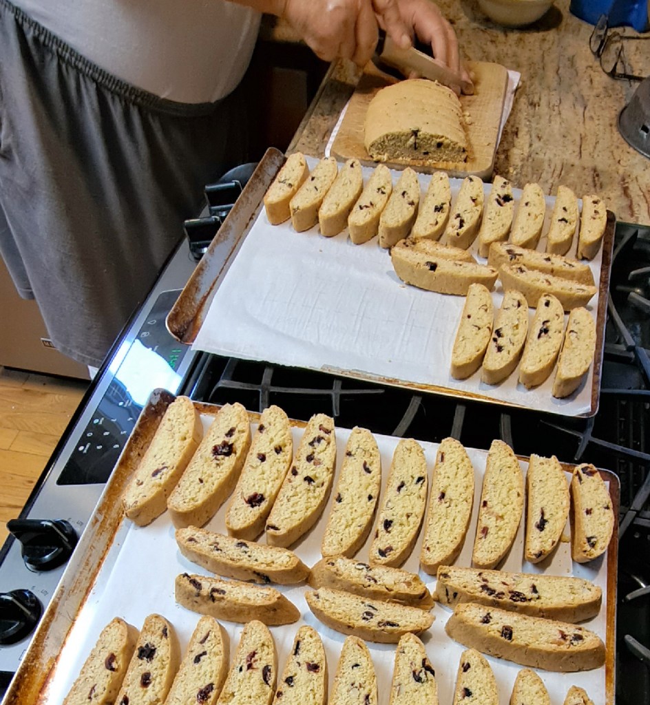In past years, he would begin making biscotti weeks in advance. They’re such a dry cookie that they seem to keep forever, that is, if we don’t eat them. However, we’ve had to cut back our production, primarily due to the increase in cost of ingredients, and especially the higher cost of shipping to our friends and relatives. So we thought that we’d share the recipe, a little updated, but anyone can follow this. Just allow some time.
