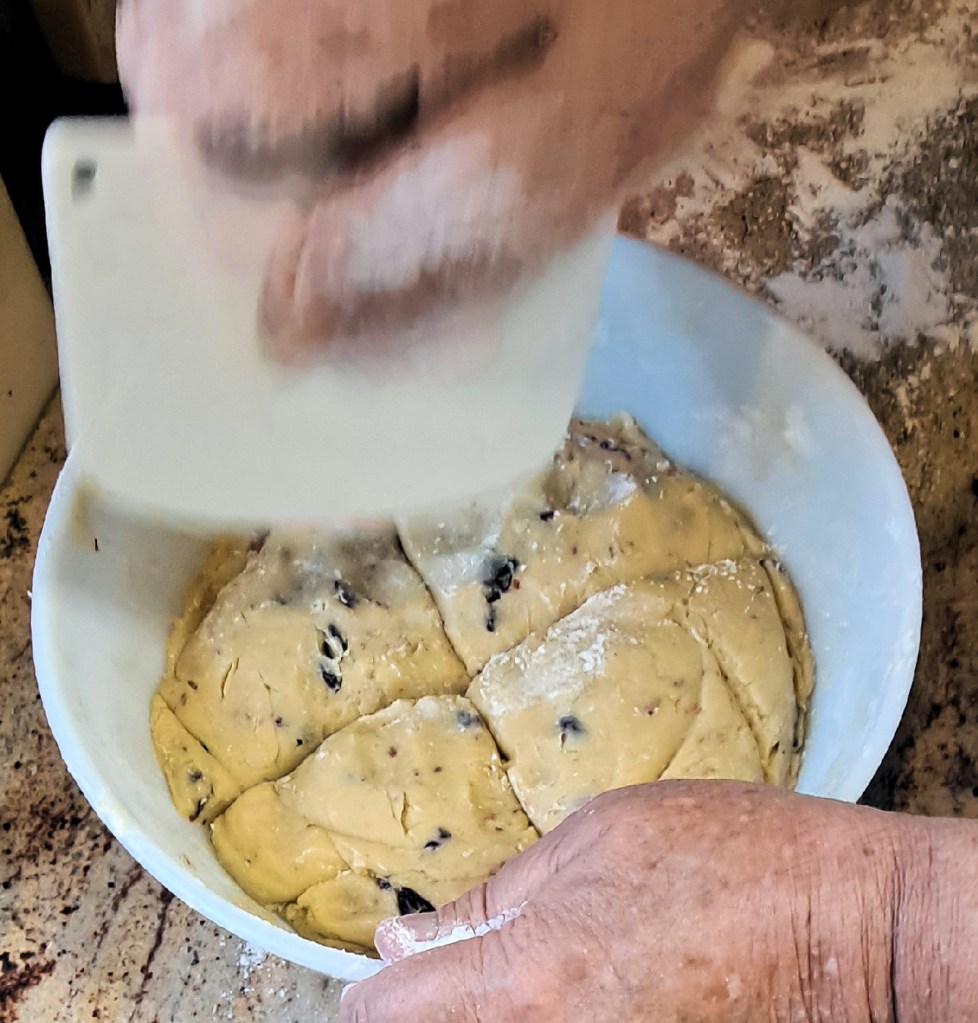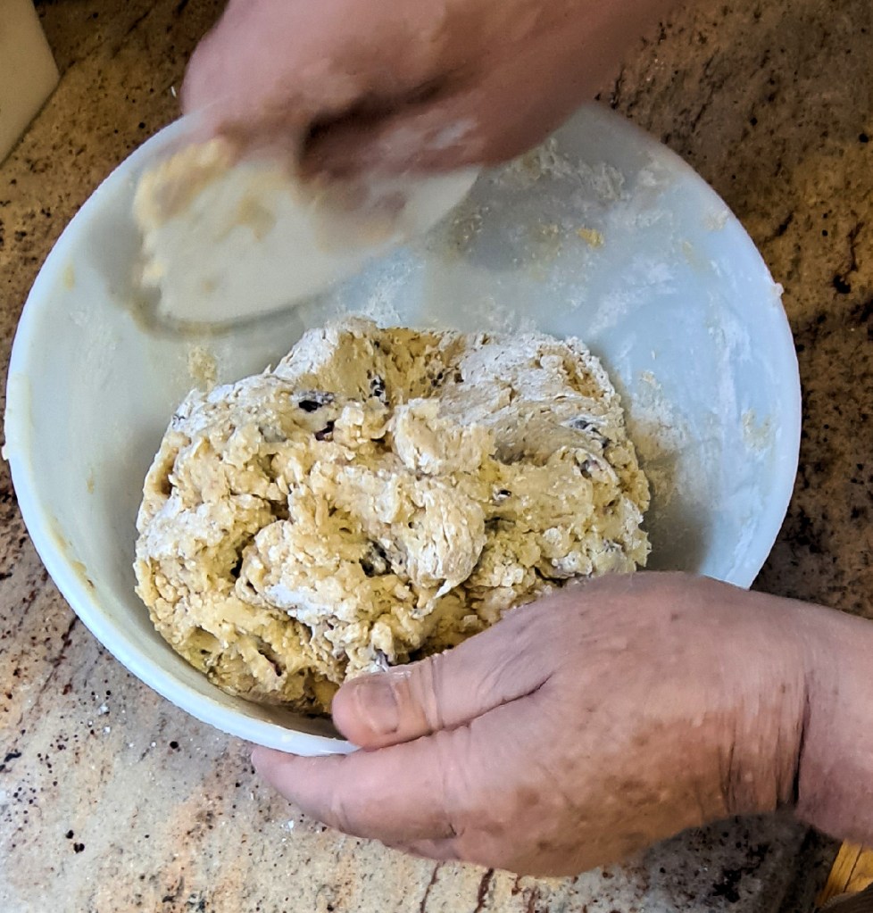 Then begin to add the dry ingredients to the wet ingredients, about a third at a time. His favorite tool is the plastic bowl scraper. You can add the nuts and fruit about half way. Keep adding all the dry ingredients. It will be a pretty stiff dough but don’t add any more liquid.