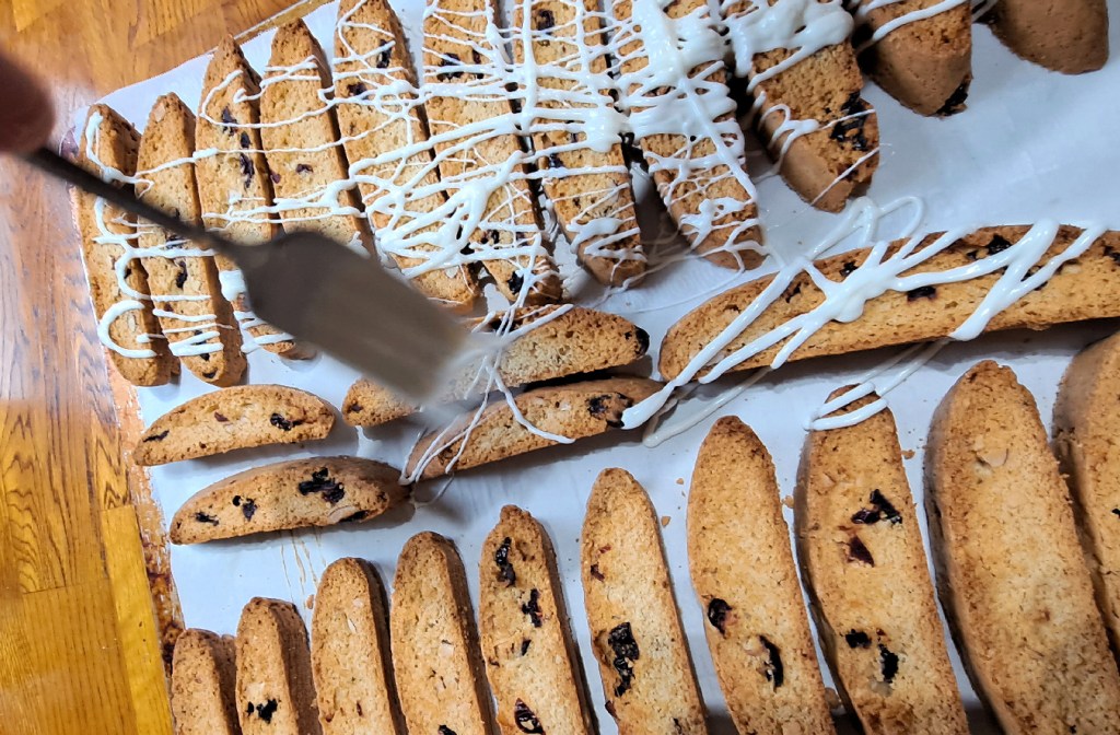 When they are cool, then prepare the icing. I like white or chocolate almond bark, melted and drizzled over the cookies. Sometimes both. Sometimes dipped one end in chocolate. Sometimes make a powder sugar/lemon juice icing.