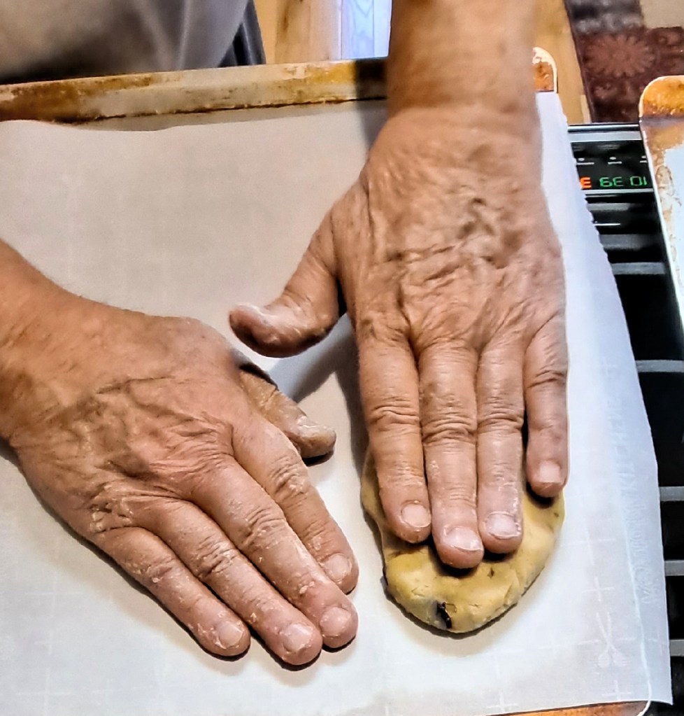 Divide the dough into four sections then place on cookie sheets covered with parchment paper. Shape into rolls and flatten. (See photo.) They’ll end up about 10 inches long and 4 or 5 inches wide. They will raise in the oven.