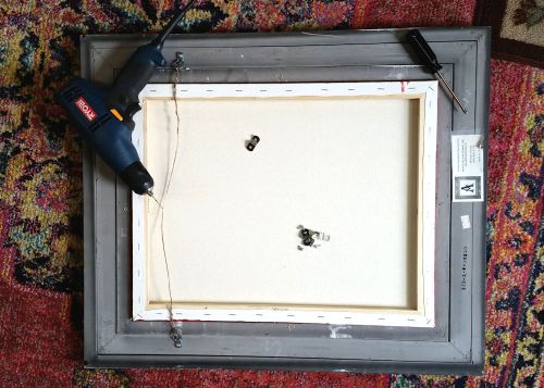 All of the Intimate Spaces: Breaking Bread series are on two inch deep gallery-wrapped canvases. This means no framing, only wiring. Actually, the process went rather quickly, especially after I bought special wire snips to cut through the plastic-covered wire. My professional wire scissors wouldn’t work.
