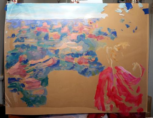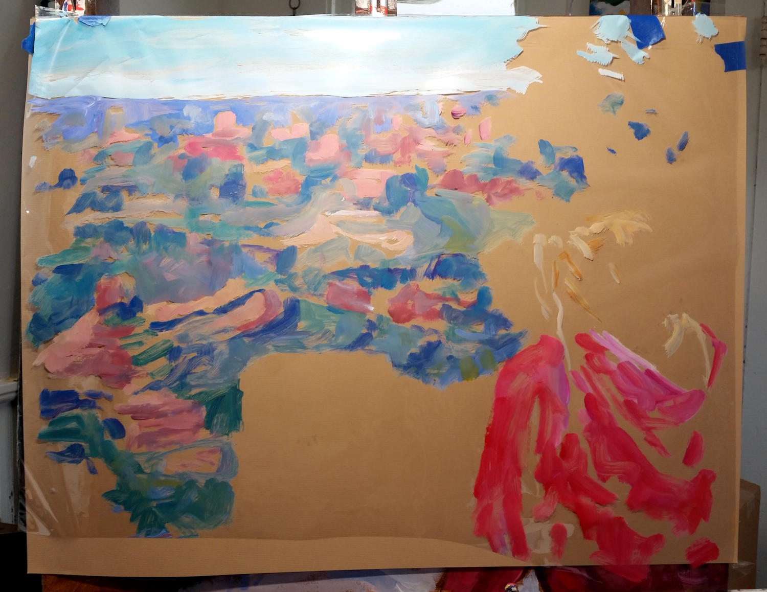 Although I love the composition of the painting, it somehow didn’t seem to give the impression of really far horizons, as anyone who has visited the great canyon can attest.  So I wanted to try to lighten the background as a test.