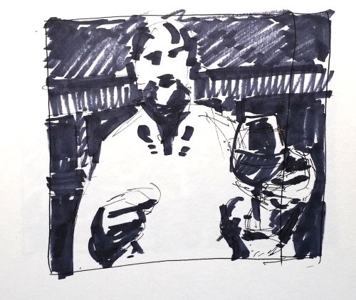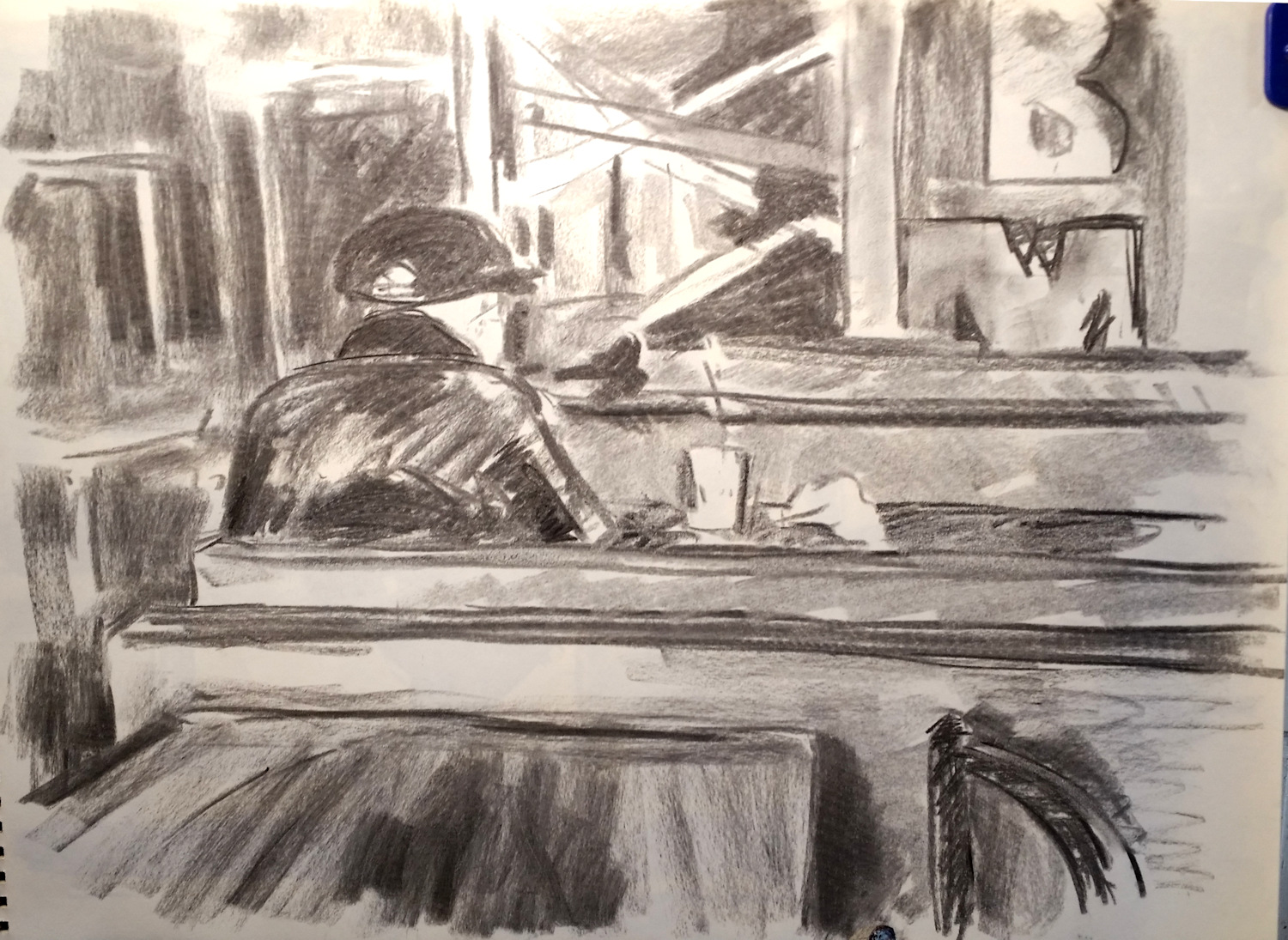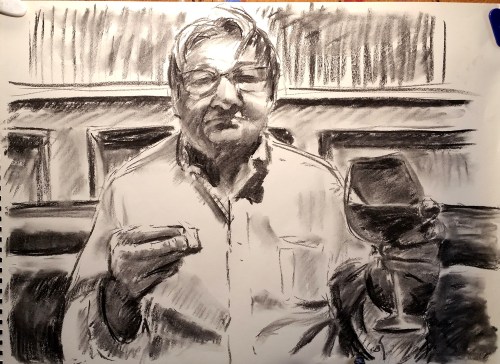 Italian Eating Italian. Charcoal sketch 18 x 24. Kit Miracle Again, the strong lighting is emphasized based on the NOTAN study but some middle tones have been included.