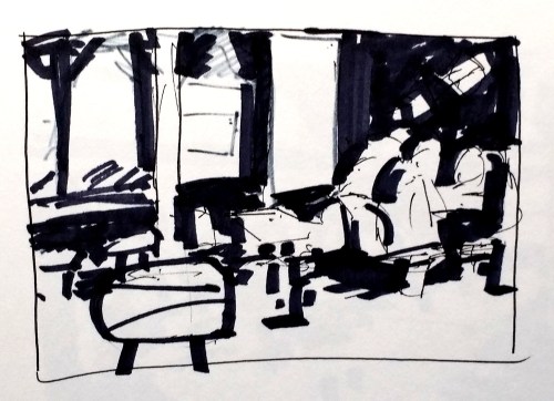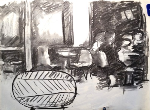 Late Night, charcoal sketch 18 x 24. Kit Miracle. Although the oval shape in the foreground (back of a chair) captures the eye first, it is then directed to the group of teens in the right rear of the picture plane. The dark window provides a perfect foil for their shapes.