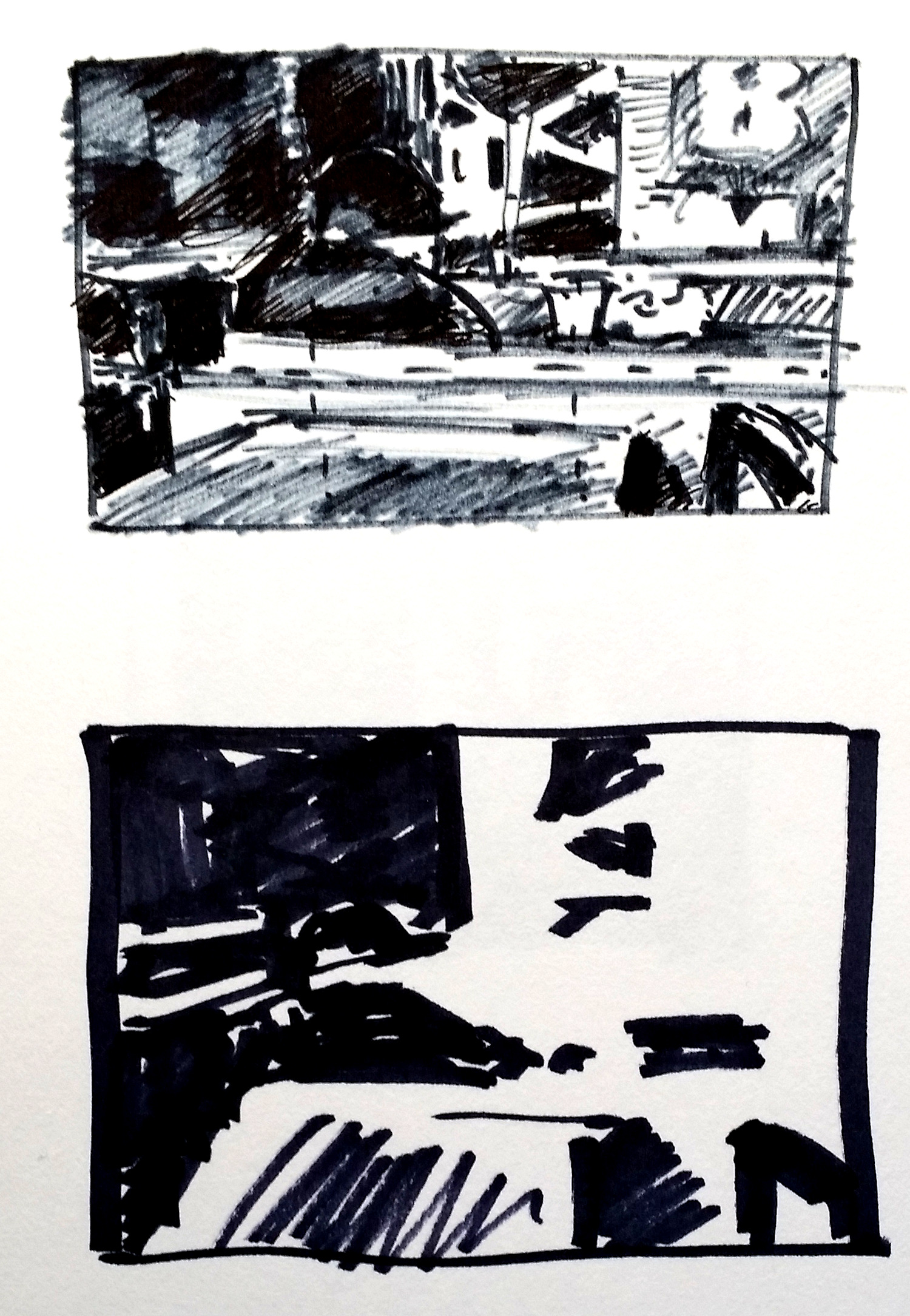 The whole idea of the NOTAN sketch is to find the best pattern for your subject. Definitely not meant for every style of painting but very helpful to establish the overall effect. As a rule, you will not want to have exactly the same amount of black and white areas in the NOTAN subject. Also, look for pleasing patterns. Don’t worry about details at this stage. As you can see, the NOTAN subjects that I’ve created here are about 5 x 7 inches, made with a Flair pen and a black art marker.