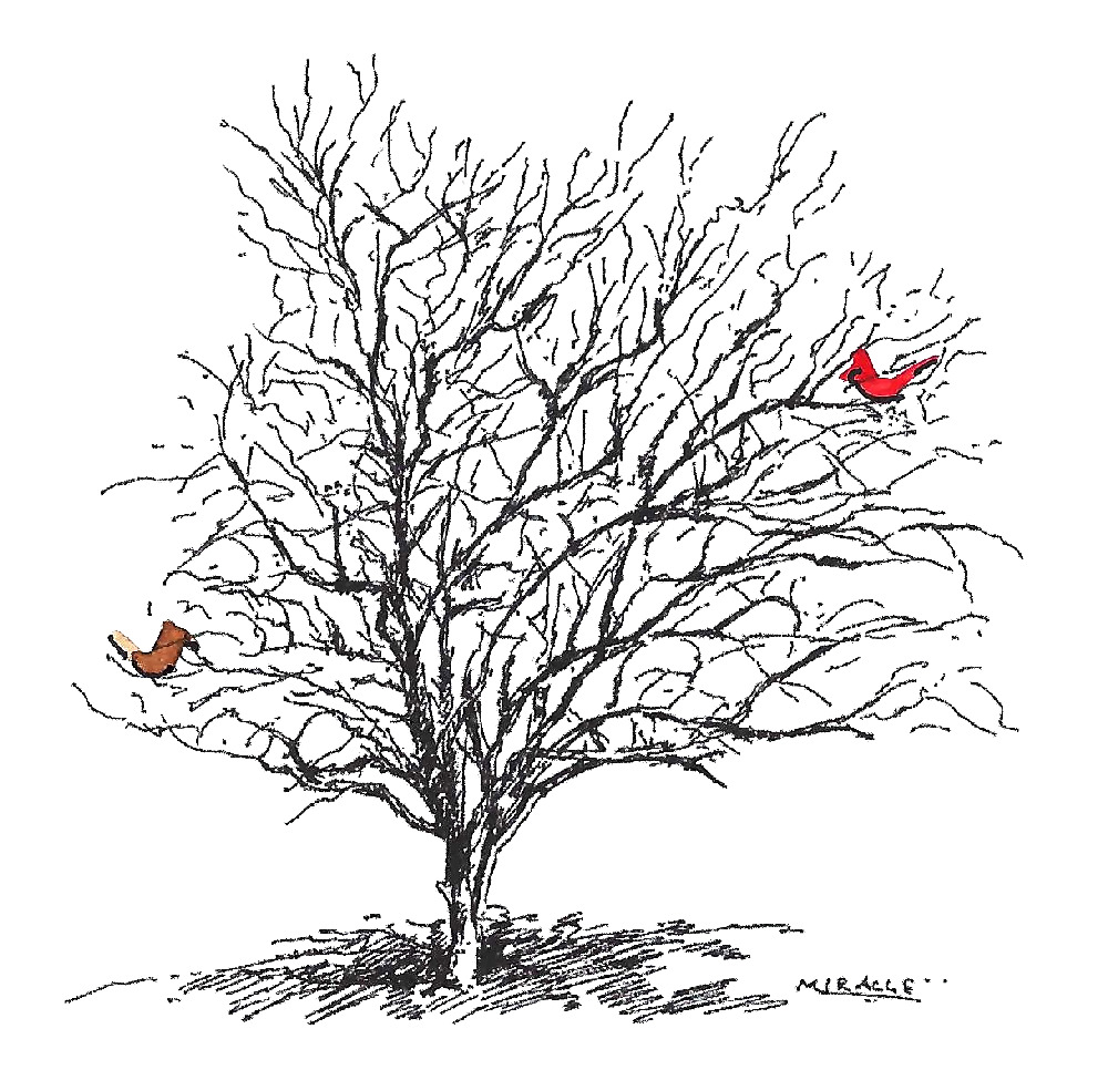 Finally, I sketched a couple of trees. An old crabapple which the grandson loves to climb. And a dogwood by the herb bed which shelters a bench, perfect for taking a break from yardwork. I have added a couple of touches of color in the form a cardinal pair. This is done after the image has been printed on heavy card stock in black and white. I’m turning this one into our Christmas card this year. So it’s part print and part original.