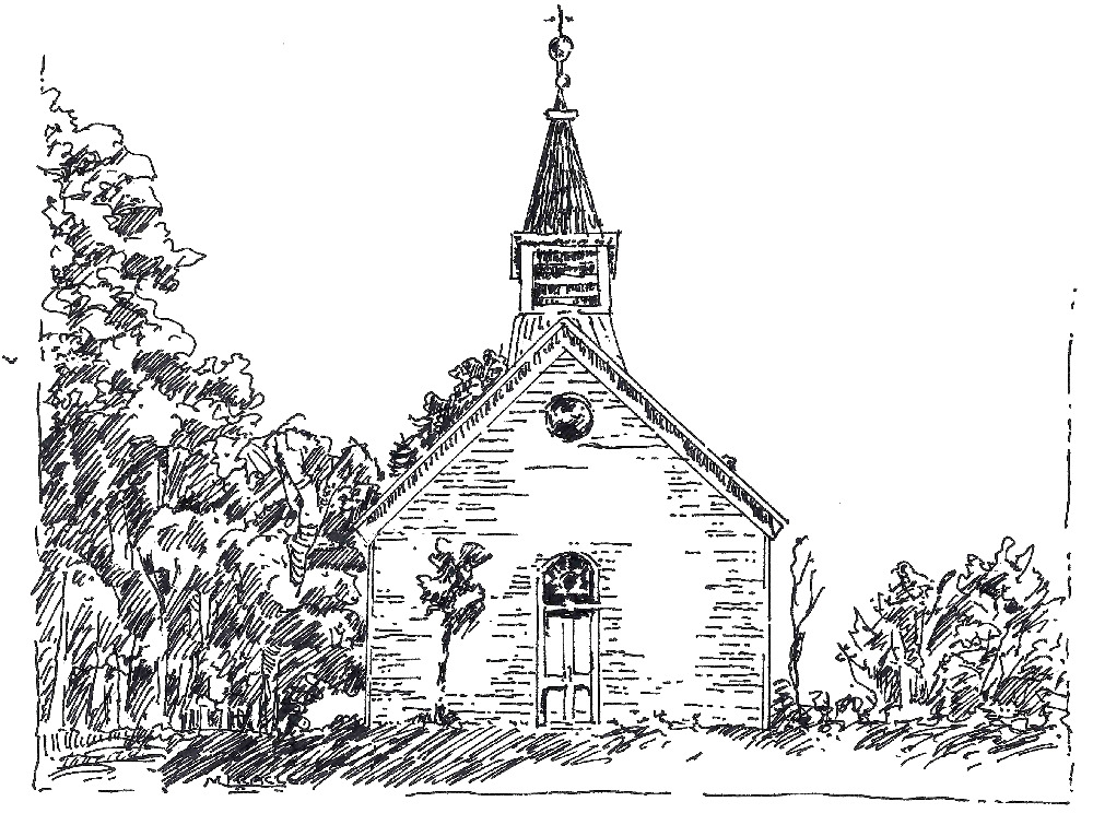The old bank building and other stores, Birdseye, Indiana, pen and ink. Kit MiracleInman Episcopal Church, first church in Birdseye, Indiana, Pen and ink drawing, Kit Miracle