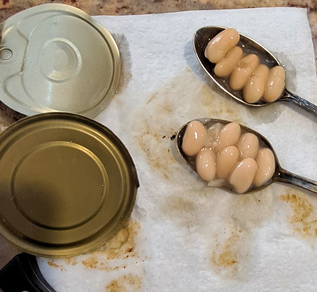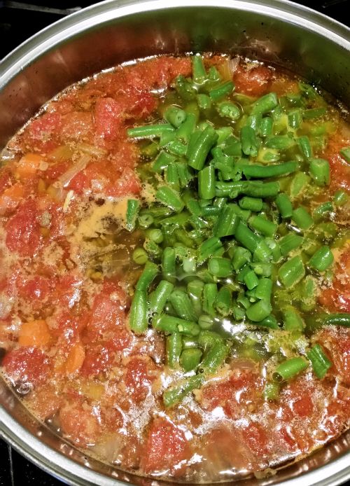 Then add the two cans of beans (drained). Frankly, I just use whatever white beans I have available. I’ve even added butter beans and it works fine.