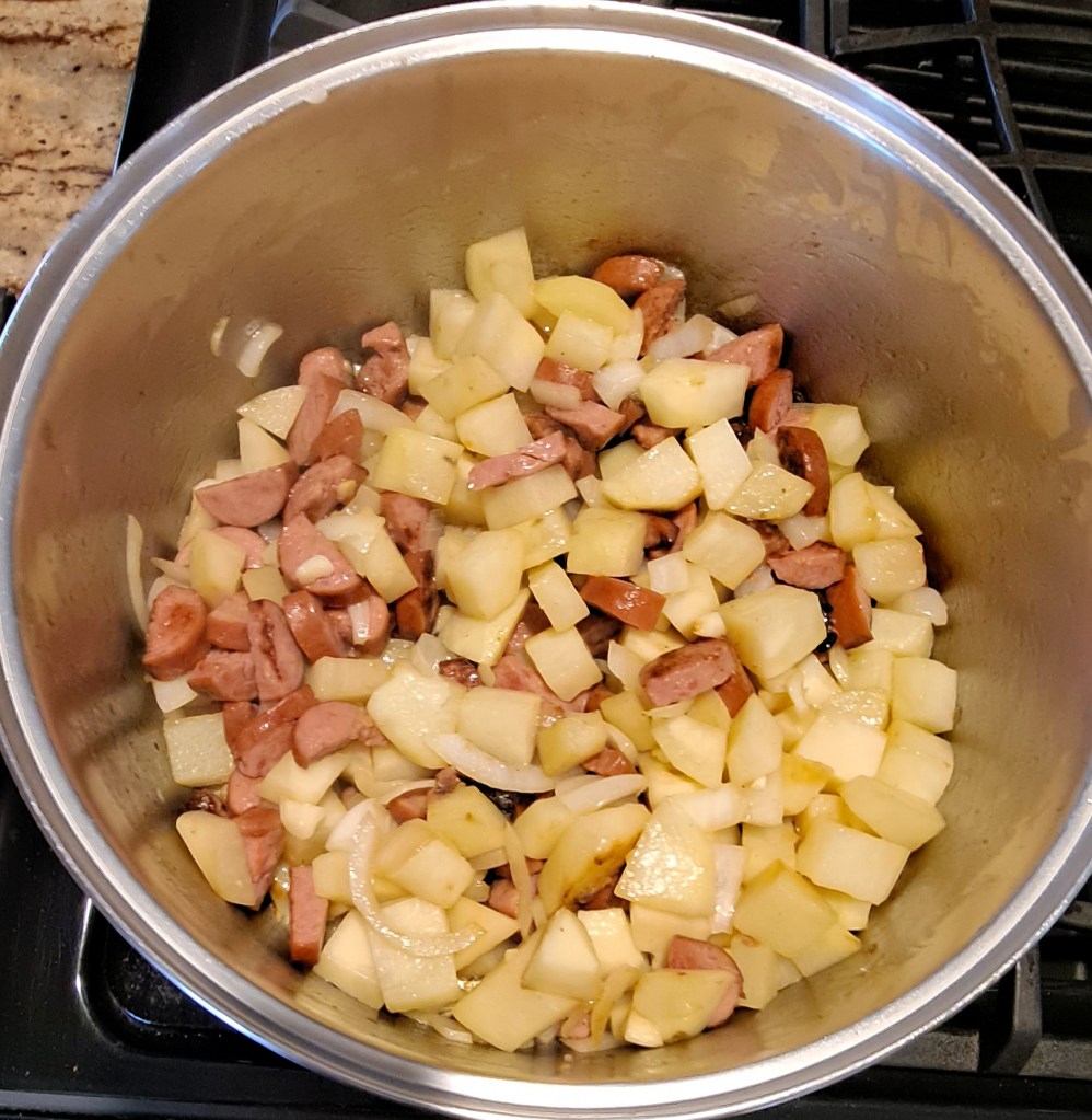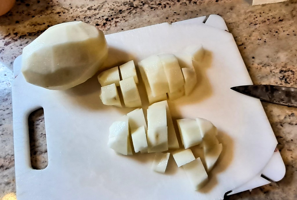 Wash and dice the potatoes. Sometimes I leave the peel on just for added texture. Add to the pot after it comes to a slow boil. Cover and bring back to simmer.