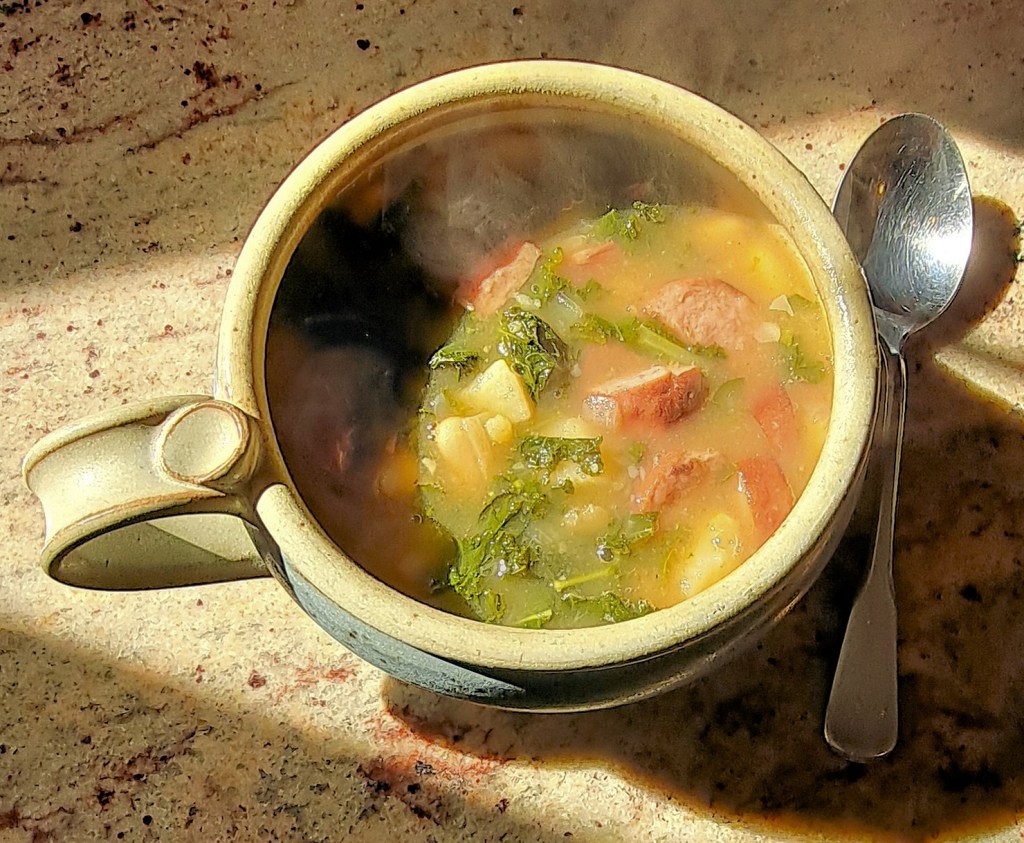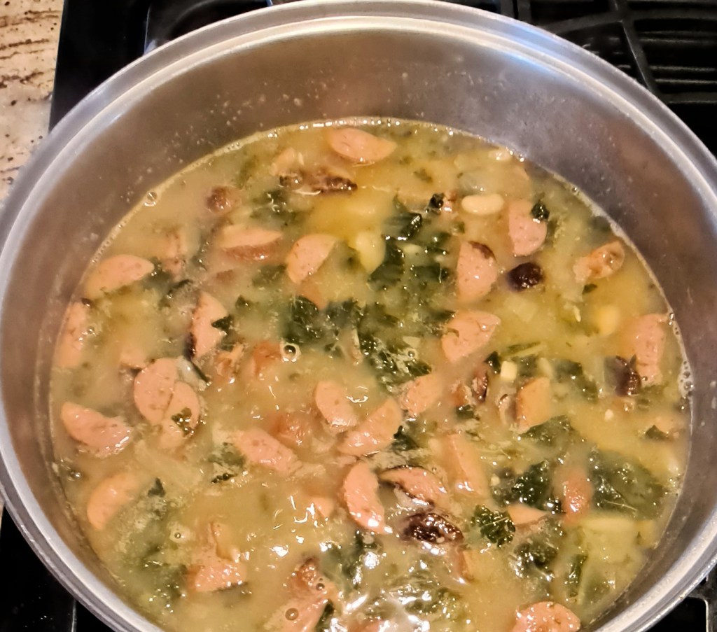 Simple ingredients: smoked sausage, onions, garlic, kale, potatoes, white beans, broth and spices. That’s pretty much it. Got company coming? Add more broth, potatoes and another can of beans.