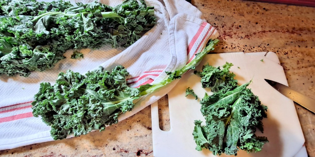 Meanwhile, wash and strip the veins out of the kale. Rough chop and add to the mixture, stirring until wilted. Add the chicken or vegetable broth and cover. Bring to simmer.