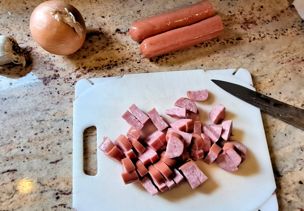 Heat the olive oil in a 6 – 8 quart soup pot. Add the chopped smoked sausage. You can use any kind of smoked sausage – regular, light, turkey, or even Polish kielbasa. Stir and brown.