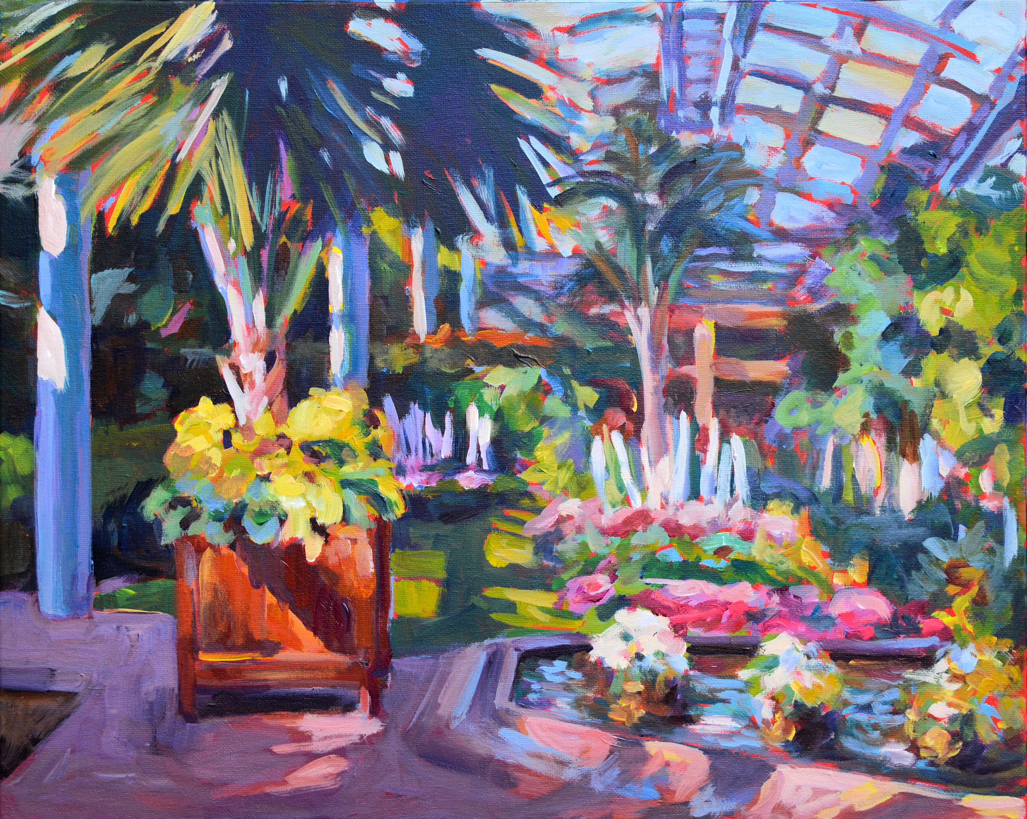 Atrium at Longwood Gardens, du Pont estate, Pennsylvania. Acrylic on canvas, 16 x 20, impressionistic style, Kit Miracle