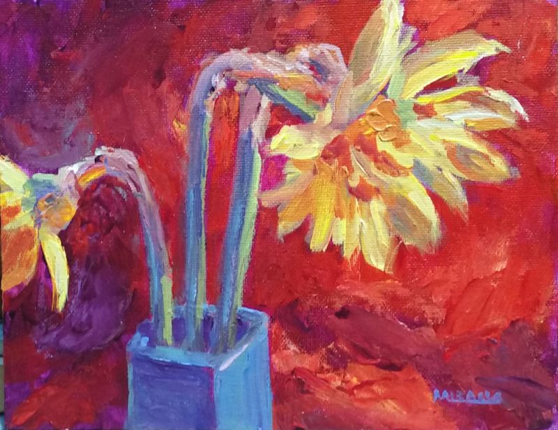 Three Daffodils in a Blue Vase – 1, 6 x 8, acrylic on canvas wood panel, Kit Miracle